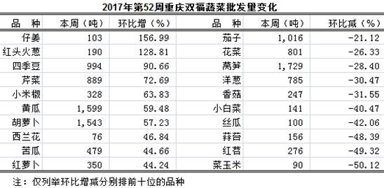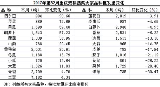 本周蔬菜批发量表现19增21减1平稳,总批发上市量比上周增1032吨,环比增2.47%,表现略增。具体表现,环比增加品种及变化: 仔姜103吨、红头火葱190吨、四季豆994吨、芹菜889吨、小米椒328吨、黄瓜1599吨、胡萝卜1543吨、西兰花76吨、苦瓜479吨、红萝卜350吨、莲藕1339吨,环比分别增156.99%、128.81%、90.66%、76.69%、63.83%、59.48%、57.23%、46.84%、44.66%、44.24%、36.95%,均表现陡增;山药、黄秧白、茭白环比分别增29.45%、25.61%、21.32%,均表现大幅增长;冬瓜、小瓜、大葱环比分别增13.79%、13.64%、11.83%,均表现明显增长。环比减少品种及变化:菜玉米90吨、红苕276吨、蒜苔156吨、丝瓜100吨、小白菜141吨、香菇247吨、洋葱785吨,环比分别减50.12%、49.32%、48.39%、42.06%、40.47%、31.55%、30.47%,均表现骤减;花菜、茄子环比分别减26.33%、21.12%,表现大幅减少;老姜、芋儿、大蒜、洗葱、韭菜环比分别减17.94%、16.57%、14.75%、13.16%、11.64%,均表现明显减少。其余品种增减幅度均在10.00%以内。(部分品种见下表)