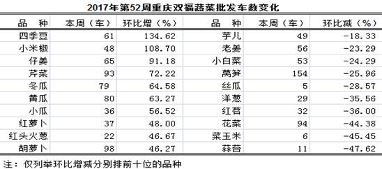 该市场本周蔬菜交易车数环比表现25增15减1平,总交易车数为3533车,与上周比上浮4.53%,表现小幅增长。具体品种表现,环比增加品种及车数:四季豆61车、小米椒48车、仔姜65车、芹菜93车、冬瓜79车、黄瓜80车、小瓜36车、红萝卜37车、红头火葱22车、胡萝卜98车、菜心54车、茭白70车、黄秧白133车、苦瓜24车,环比分别增134.62%、108.70%、91.18%、72.22%、64.58%、63.27%、56.52%、48.00%、46.67%、46.27%、42.11%、37.25%、34.34%、33.33%,均表现陡增;青椒217车、山药56车,环比分别增22.60%、21.74%,均表现大幅增长;瓢儿白、茄子、莲藕、老南瓜、韭菜环比分别增19.48%、17.91%、17.76%、15.87%、15.38%,均表现明显增长。环比减少品种及车数:蒜苔11车、菜玉米6车、花菜94车、红苕32车、洋葱29车,环比分别减47.62%、45.45%、44.38%、36.00%、35.56%,均表现骤减;丝瓜5车、莴笋154车、小白菜53车、老姜56车,环比分别减28.57%、25.96%、24.29%、23.29%,均表现大幅减少;芋儿、白萝卜、土豆、大蒜、莲花白环比分别减18.33%、16.61%、12.64%、12.50%、10.48%,均表现明显减少。其他品种增减幅度均在10.00%以内。(增减前十位品种见下表)