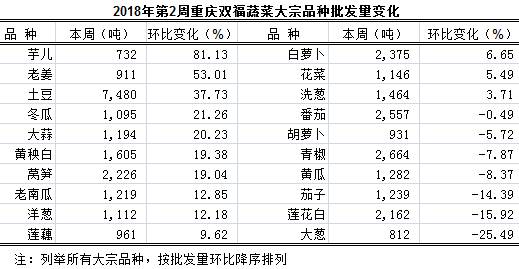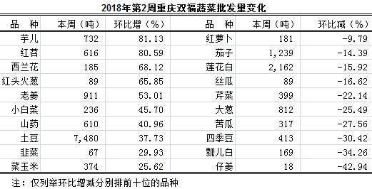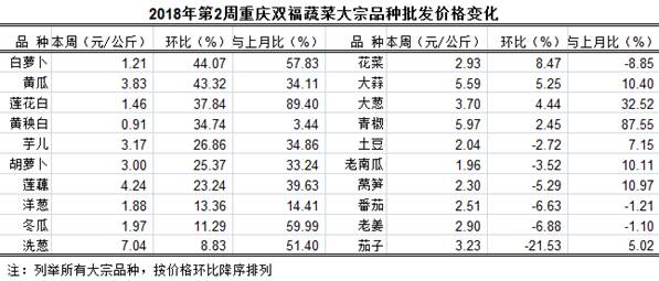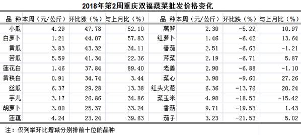 通过对我市最大的蔬菜批发市场--双福国际农贸城第2周(1月8日—1月14日)42个品种蔬菜批发交易情况监测,总体表现,与上一周比:批发总量增长、大宗品种批发量明显增长; 总体算术批发均价、大宗品种算术批发均价均上涨; 总交易车数小幅增长。与上月比:总体算术批发均价大幅上涨、大宗品种算术批发均价明显上涨。