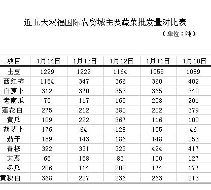 根据重庆市农业信息中心对我市最大蔬菜批发市场--双福国际农贸城蔬菜批发量监测,该市场1月14日监测的38个品种总体批发量比上一日下滑4.09%,表现小幅减少;比上一周日均量增3.10%,表现略增。其中日批发量在100吨以上的大宗蔬菜批发量比上一日下滑3.56%,表现略减;与上一周日均量比增4.45%,表现小幅增加。