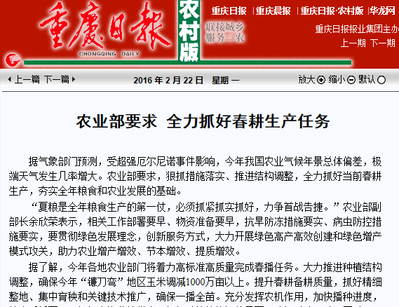 重庆日报:农业部要求 全力抓好春耕生产任务